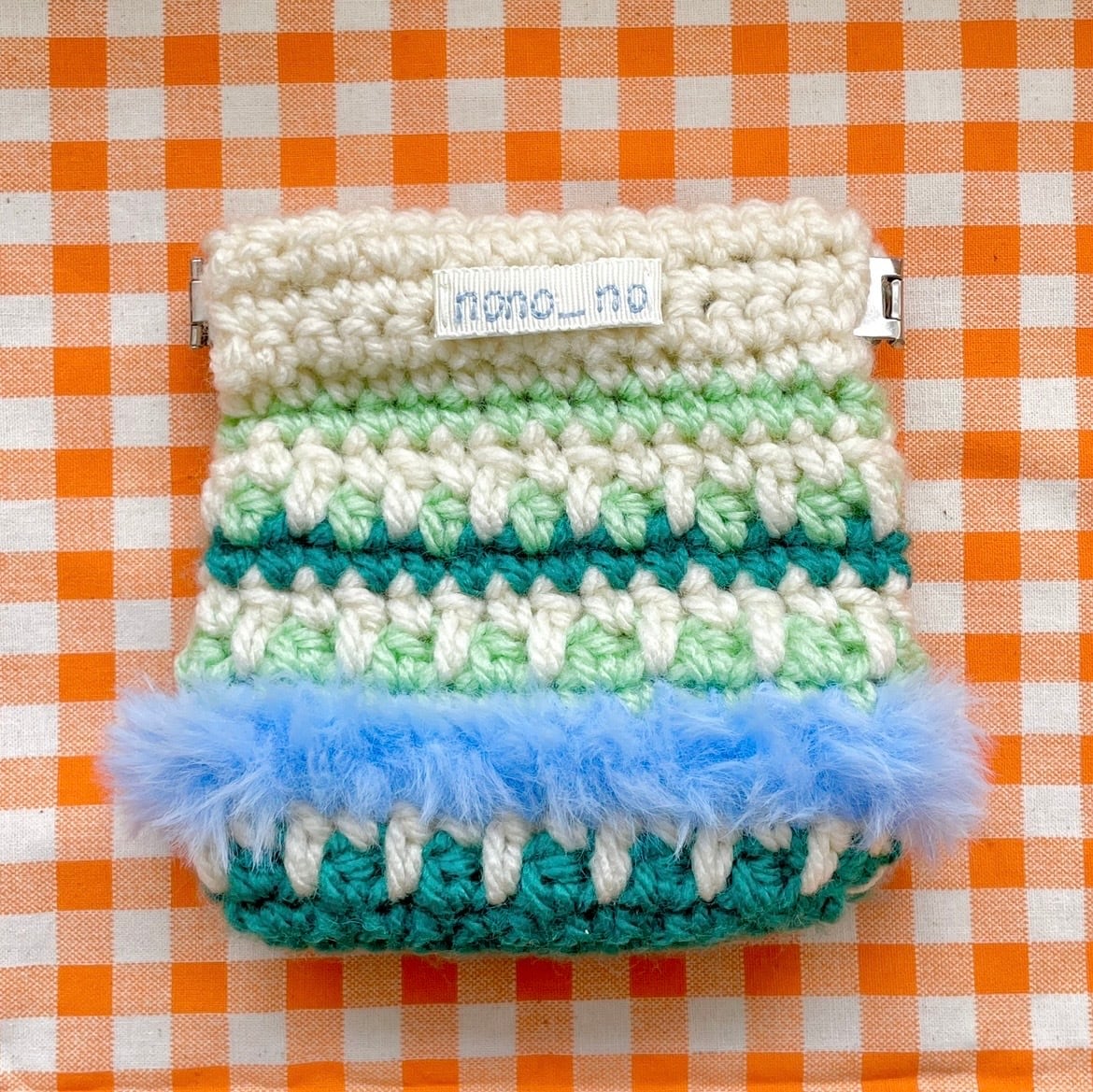 ポーチ 編み物 裏地付き バネ口金 小物入れ 水色 グリーン モケモケ 小銭入れ 財布